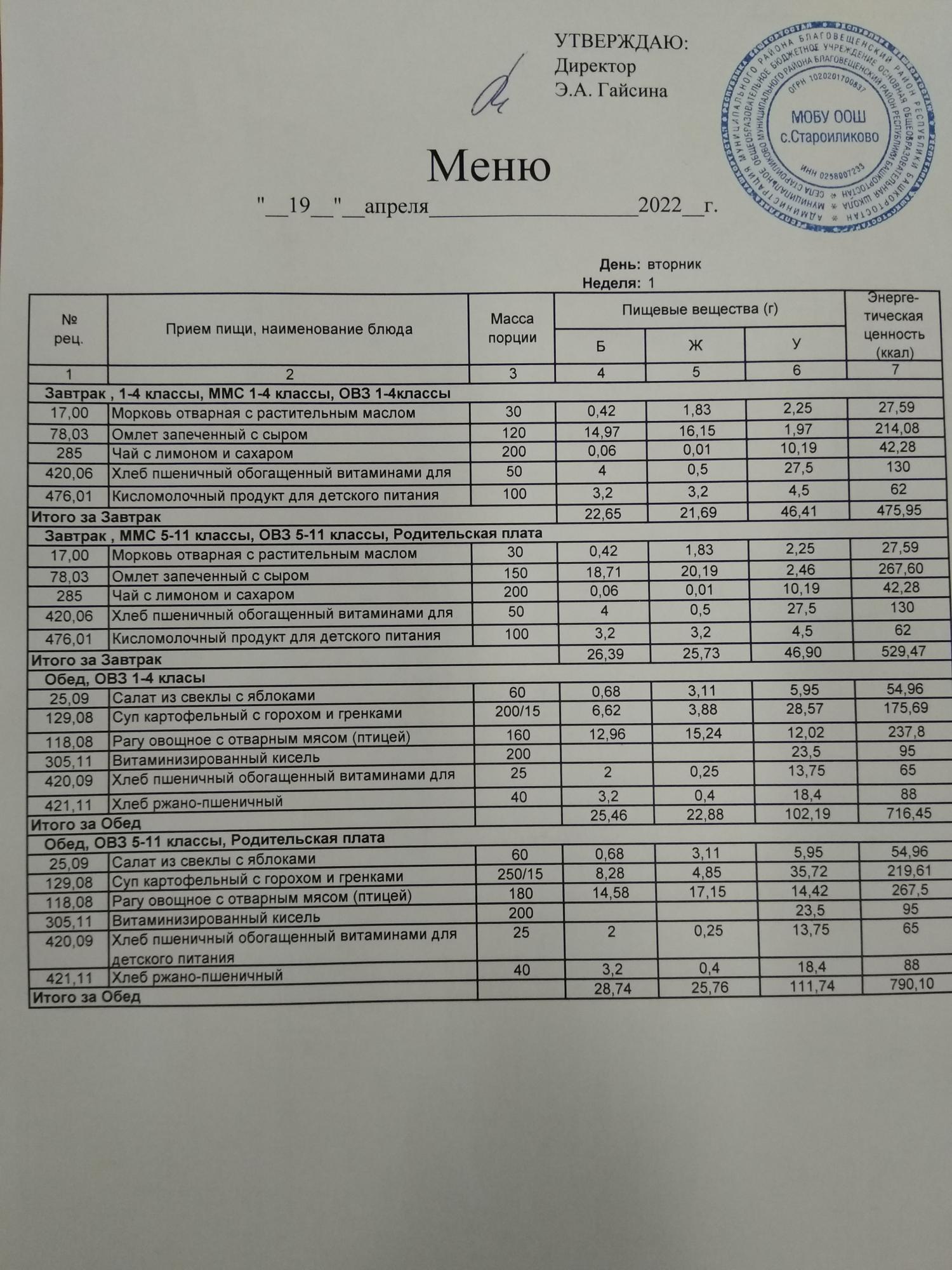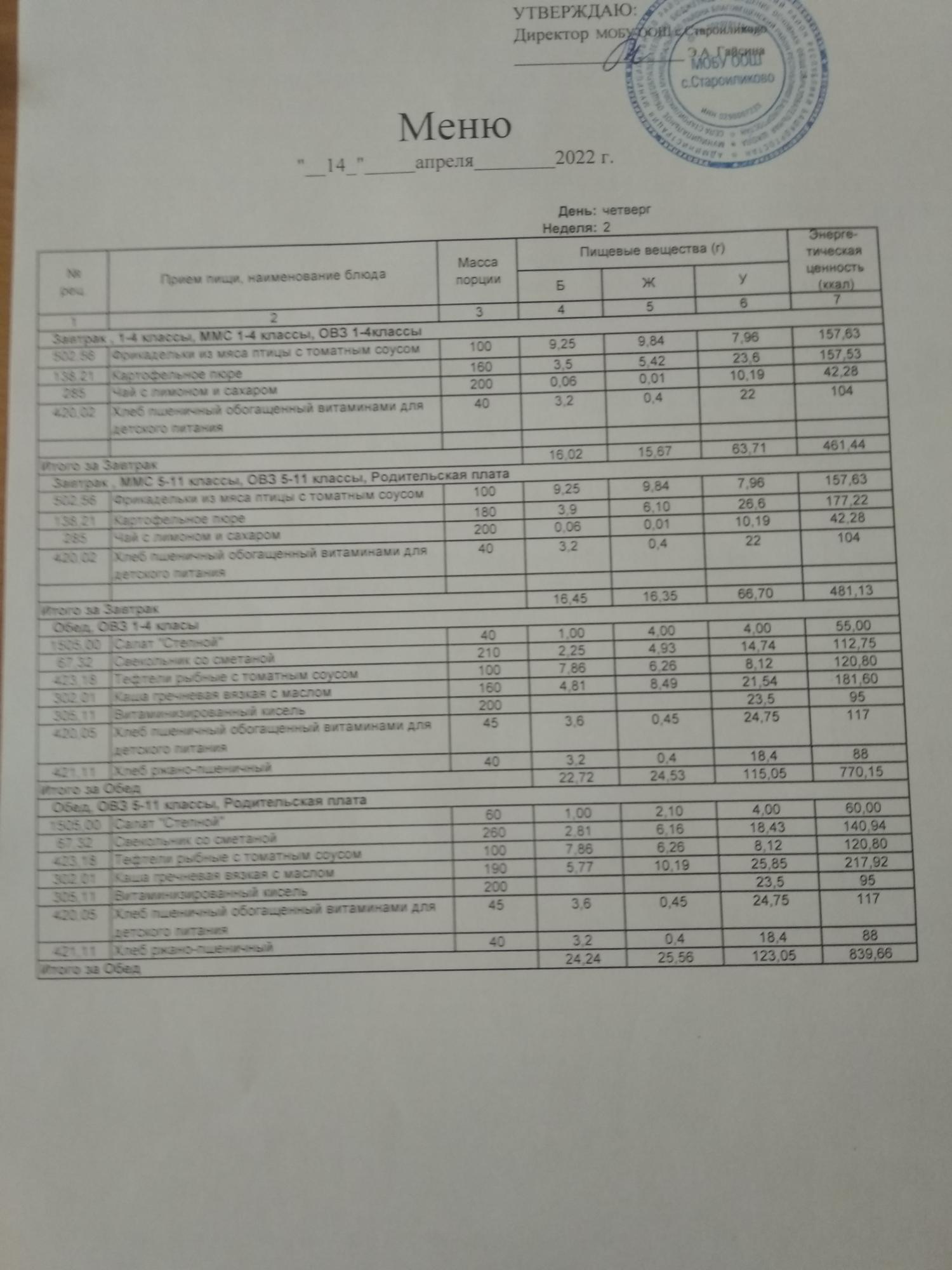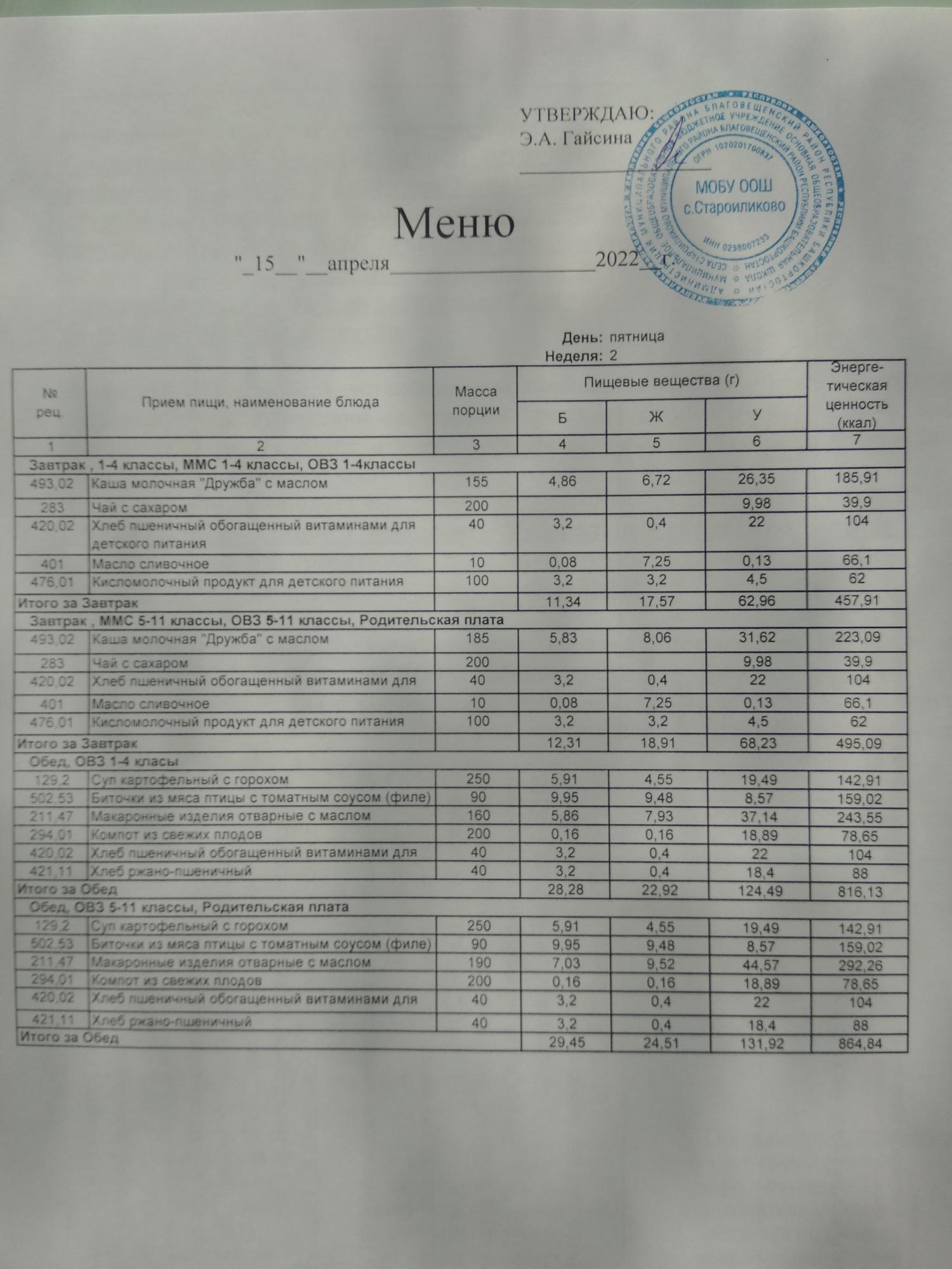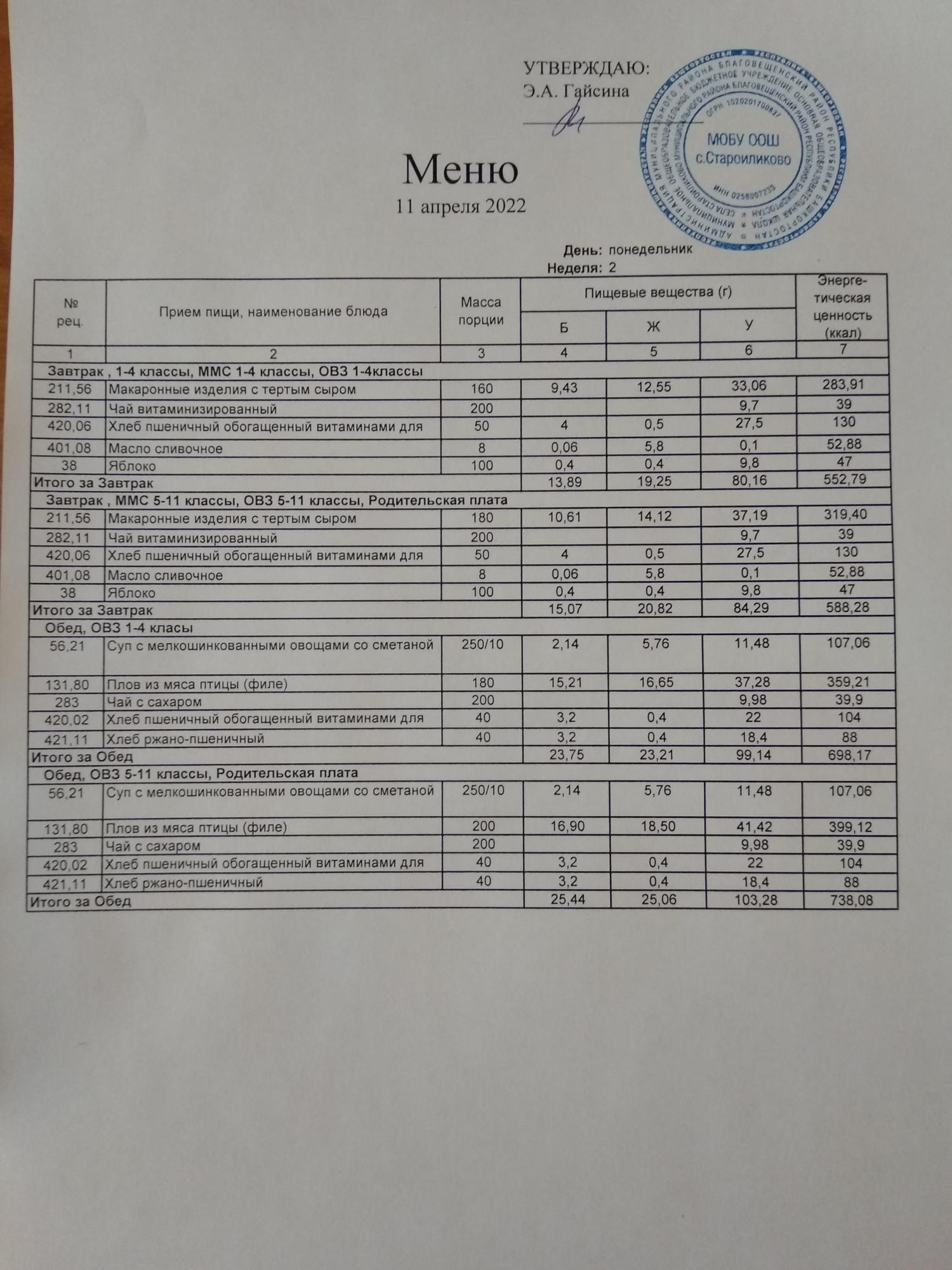 Стоимость школьного питания